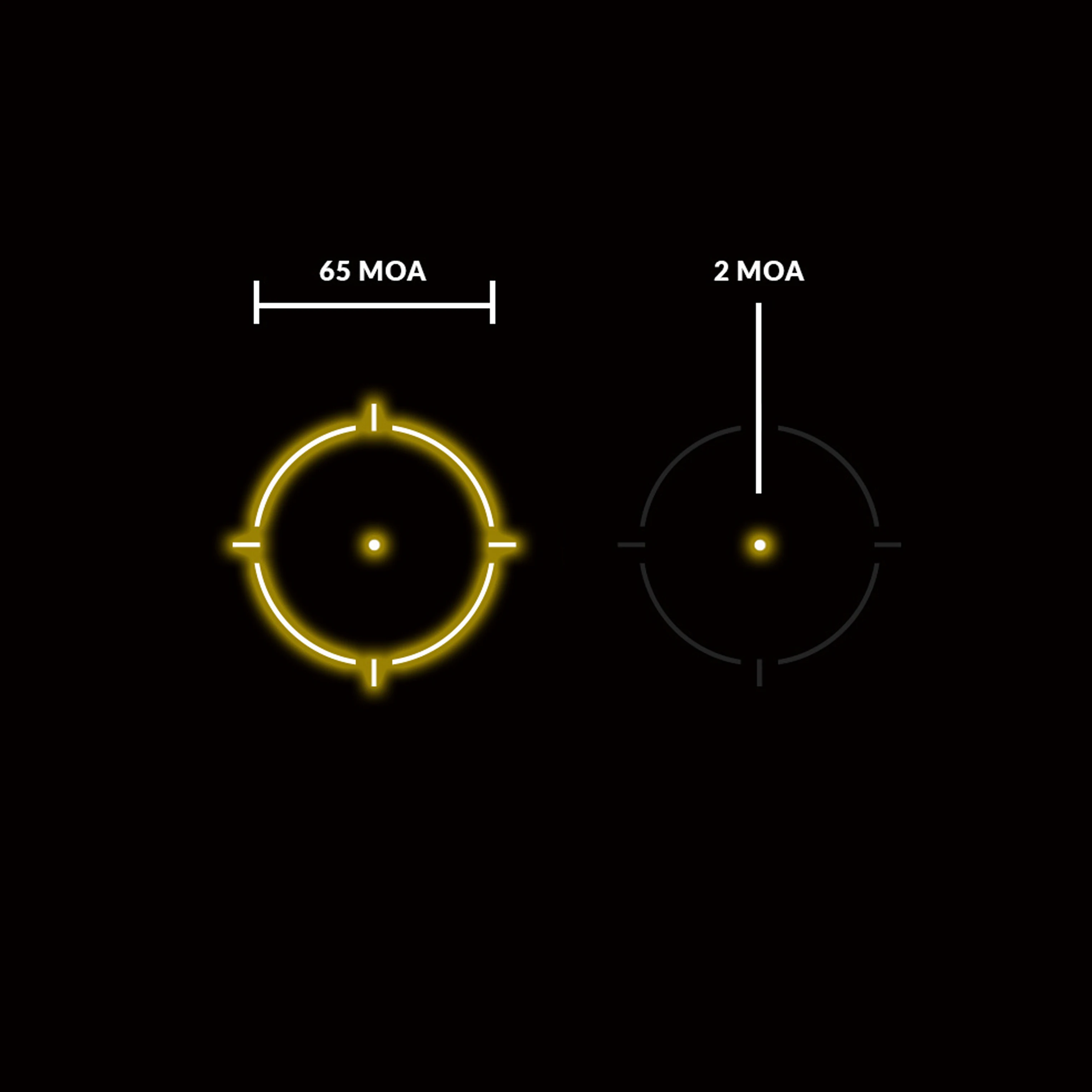 Złoty punkt celowniczy w systemie Multi Reticle (kropka 2 MOA + okrąg 65 MOA lub sama kropka)