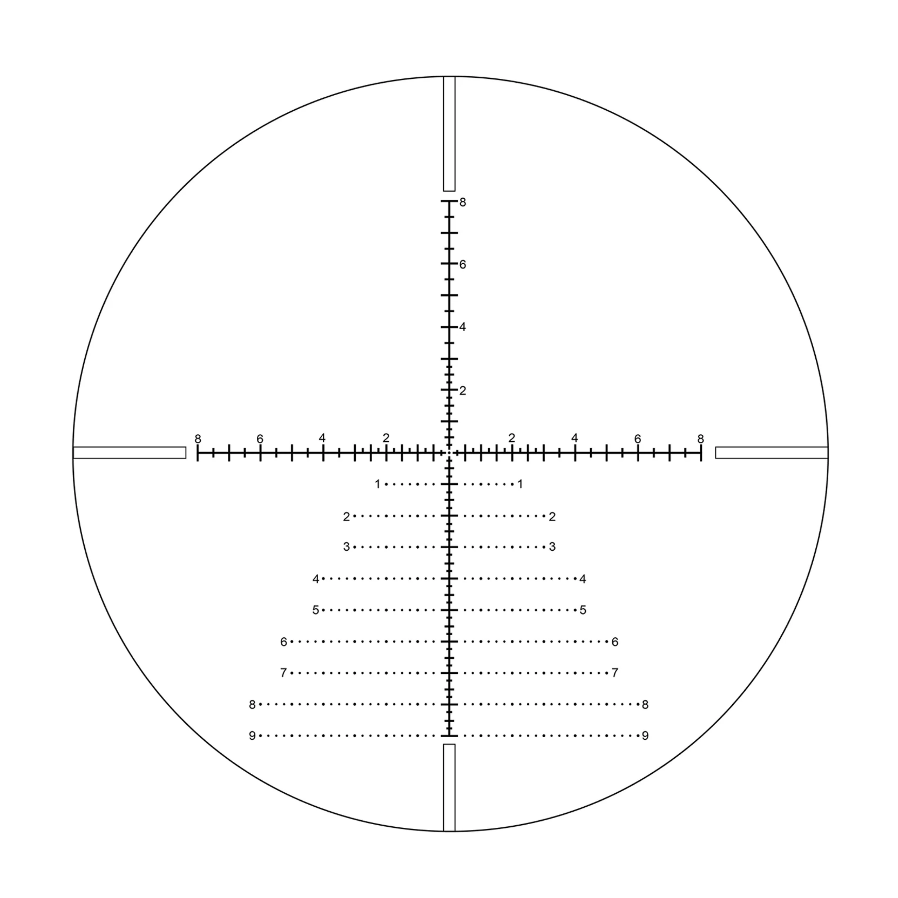 MAT-1 łączy pasywne dalmierzenie z kropkami MIL, pozwalając na estymację odległości i poprawkę do ~17 mrad w pionie oraz 16 mrad w poziomie - idealne do szybkich obliczeń balistycznych przy znanej amunicji.