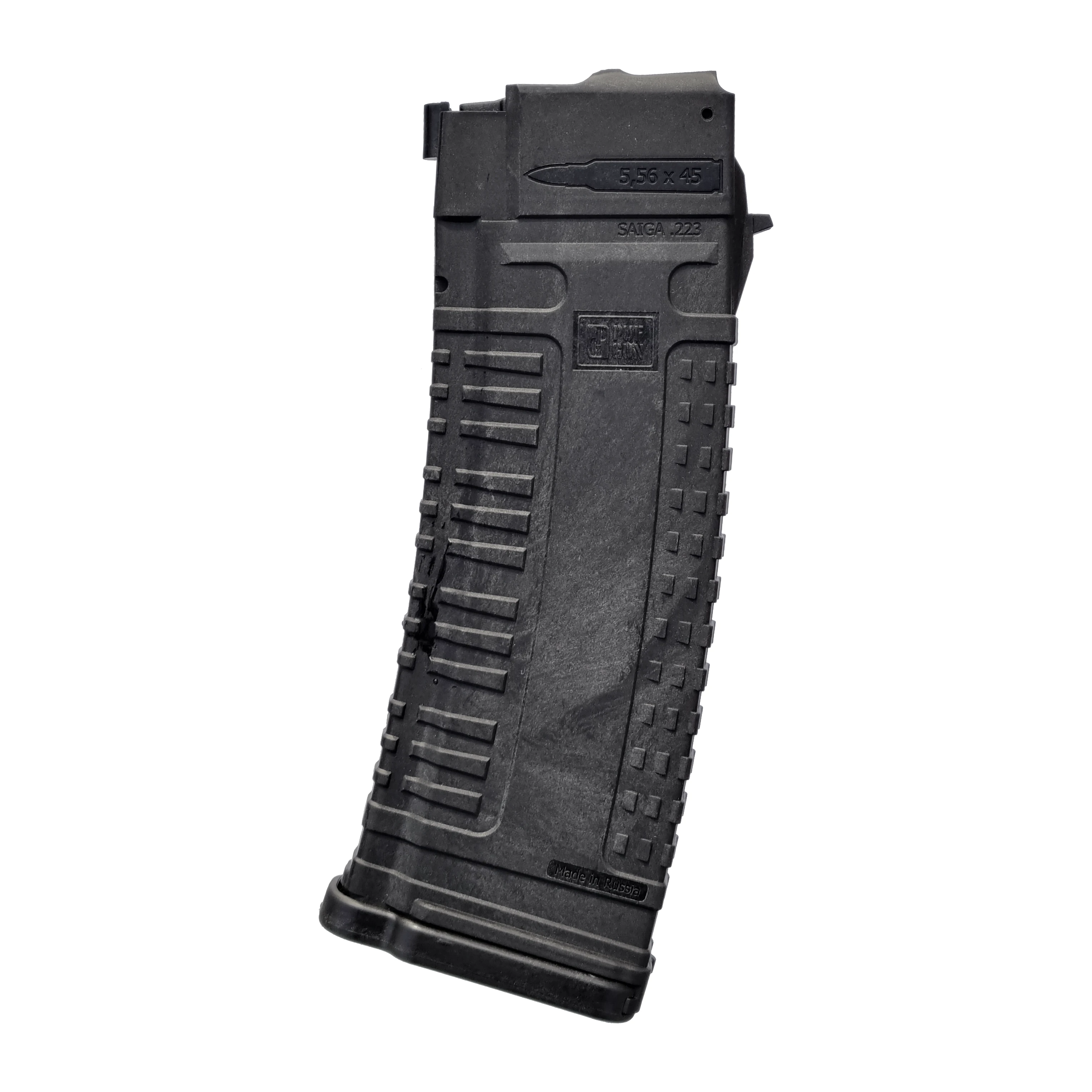 Rosyjski polimerowy magazynek do karabinów Saiga w kalibrze 5.56 mm. Wersja na 30 naboi, wyposażona w rampę nabojową.